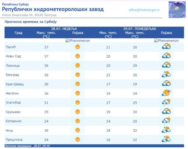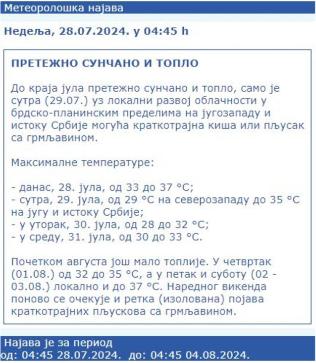 U Beogradu će takođe biti sunčano i veoma toplo. Duvaće slab i umeren jugoistočni vetar, koji će tokom noći biti u skretanju na severozapadni. Najniža temperatura biće od 16 stepeni do 21, a najviša oko 36 stepeni.