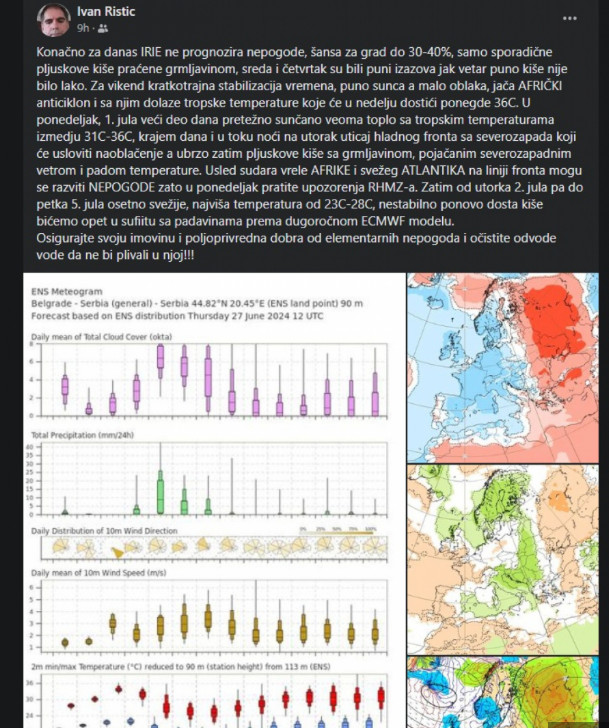 Konačno za danas IRIE meteorološki model ne prognozira nepogode, šansa za grad do 30-40%, samo sporadične pljuskove kiše praćene grmljavinom, piše meteorolog Ivan Ristić u novoj prognozi vremena za Srbiju.