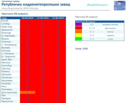 Kada u tabeli ima narandžastih polja, to znači da se u tim mestima očekuje vreme rizično po zdravlje.