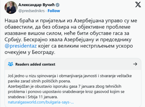 – Naša braća i prijatelji iz Azerbejdžana upravo su me obavestili, da bez obzira na objektivne probleme izazvane višom silom, neće biti obustave gasa za Srbiju. Beskrajno hvala Azerbejdžanu i predsedniku Alijevu, kojeg sa velikim nestrpljenjem uskoro očekujem u Beogradu – saopštio je predsednik Vučić na mreži „Iks“.