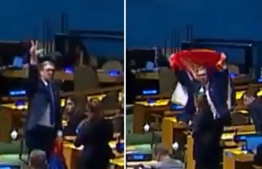 Nakon završene sednice GS UN, predsednik je ustao, široko razvio srpsku trobojku i pokazao tri prsta.