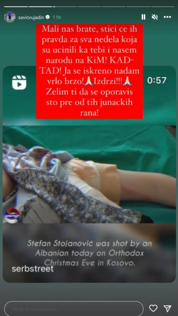 „Mali naš brate, stići će ih pravda za sva nedela koja su učinili ka tebi i našem narodu na KiM! Kad-tad! Ja se iskreno nadam vrlo brzo! izdrži! Želim ti da se oporaviš što pre od tih junačnih rana“, napisao je Vujadin uz potresni snimak dečaka koji leži na bolničkom krevetu.
