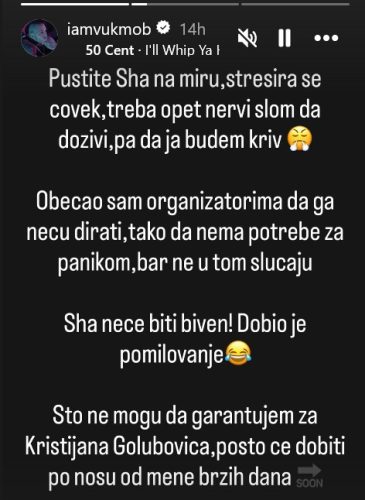 „Pustite Ša na miru, stresira se čovek, treba opet nervni slom da doživi, pa da ja budem kriv. Obećao sam organizatorima da ga neću dirati, tako da nema potrebe za panikom, bar ne u tom slučaju. Ša neće biti biven! Dobio je pomilovanje. Što ne mogu da garantujem za Kristijana Golubovića, pošto će dobiti po nosu od mene brzih dana….“