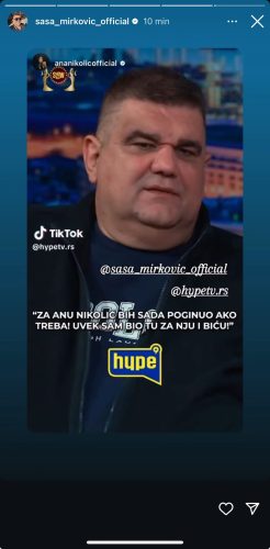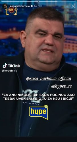 – Zato ja cenim Anu Nikolić! Za Anu ću sada poginuti ako treba! Zato što je došla i ispričala istinu kod Stefana Usiljanina. Rekla je ono što je suština. Za Anu sam uvek tu bio i biću i poginuću za nju da joj napravim nešto dobro u karijeri zato što je iskrena, korektna i poštena – rekao je Saša Mirković u emisiji „SHOWBLIZ“