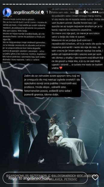 – Ja sam srećna sišla sa bine i to mi je najvažnije. Rekla sam sebi, bravo! I mislim da jesam uspela da pobedim sebe i imam mnogo manju tremu. Vi što imate da mi kažete nešto ružno, treba da vam budem primer. Budite hrabri kao i ja i suočite se sa svojim najvećim strahom jer je to korak napred ka najvećim uspesima. Za mene ovo nije pad, a mene je ovo takav vetar u leđa da niste ni sami svesni. Masovno mi se javljaju ljudi šokirani i nezadovoljni ishodom, ali to je nešto što sada ne možemo promeniti i nešto što nije do nas. Ja sam srećna jer imam odličan nastup iza sebe, i jedan od najatraktivnijih i srećna sam jer sam već danas u studiju i završavam svoju album koji će govoriti u moje ime, a ja ću sad malo ugasiti i skloniti, a čućete me kada se budem vratila. – dodala je Angelina.