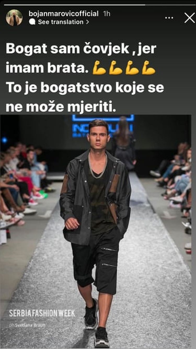 Popularni pevač često je isticao da mu je mlađi brat večita inspiracija i da je veoma ponosan na njega čemu svedoči i nova objava na Bojanovom Instagramu. Naime, Marković je podelio fotografiju svog brata ispod koje je napisao emotivnu poruku.