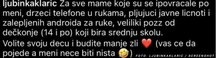 – Za sve mame koje su se ispovraćale po meni, držeći telefone u rukama, pljujući javne ličnosti, veliki pozdrav od dečkonje koji bira srednju školu. Volite svoju decu i budite manje zli. Vas će da pojede, a meni neće biti ništa – napisala je gumica.