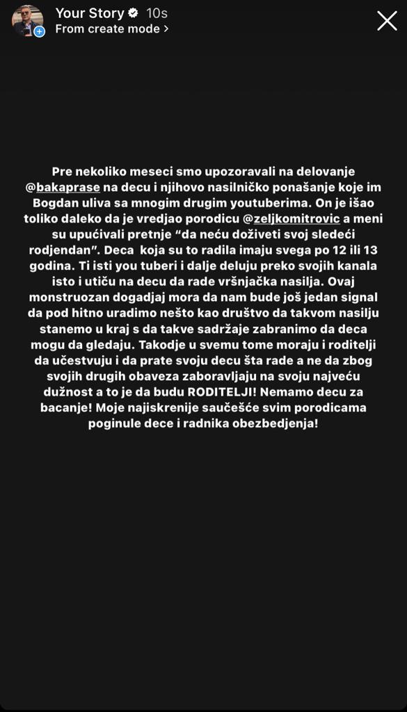 -Ovaj monstruozan događaj mora biti još jedan signal da pod hitno uradimo nešto kao društvo da takvom nasilju stanemo u kraj, a da takve sadržaje zabranimo deci da gledaju. Roditelji takođe moraju da učestvuju i da prate svoju decu šta rade, umesto da zbog svojih drugih obaveza zaboravljaju na svoju najveću dužnost, a to je da budu RODITELJI! Nemamo decu za bacanje! – napisao je producent.