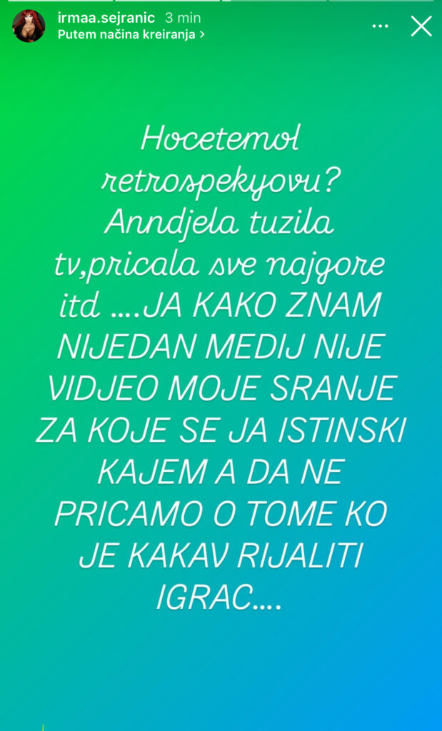 “Hocemo li retrospektivu? Anđela tuzila tv, pricala sue najgore itd ….JA KAKO ZNAM NIJEDAN MEDIJ NIJE VIDEO MOJE SR*NJE ZA KOJE SE JA ISTINSKI KAJEM A DA NE PRICAMO O TOME KO JE KAKAV RIJALITI IGRAC….”., napisala je.