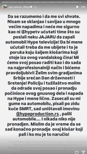 “Da se razumemo i da me svi shvate. Nisam se sklanjao i savijao u mnogo većim napadima. I ni mene, kao ni @hypetv neće ućutati time što su poslali neku jajaru da zapali automobil Hype TV. Da bi mene ućutali treba da me ubijete i to je poruka koju šaljem klošarima koji stoje iza ovog vandalskog čina! Mi ćemo svoj posao raditi kao i do sada na najprofesionalniji način i bićemo pravdoljubivi!”, napisao je Mirković, a potom čestitao Dan državnosti Republike Srbije.