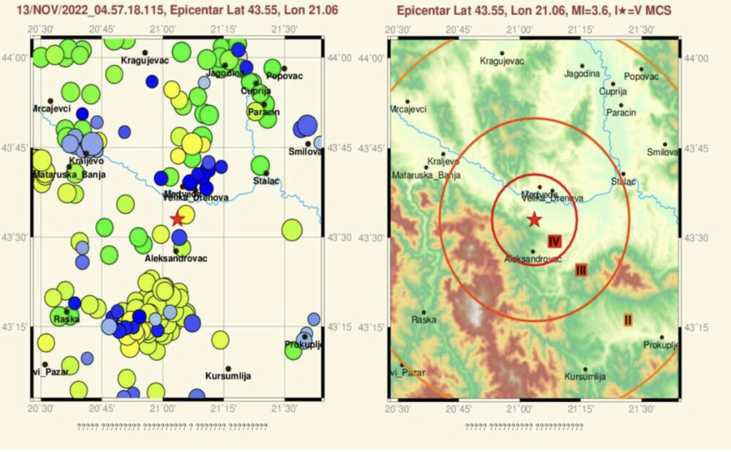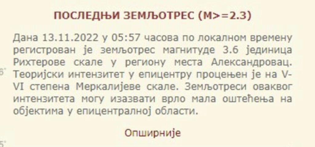 Republički seizmološki zavod objavio je da je region Aleksandrovca u 5.57 sati pogodio zemljotres od 3,6 stepeni po Rihteru.