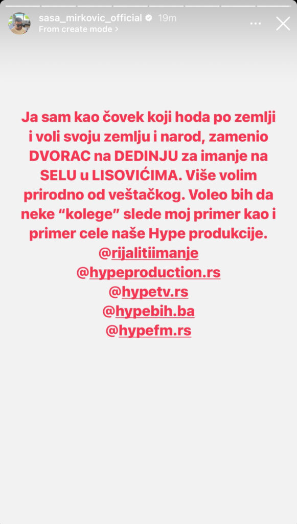 “Ja sam kao čovek koji hoda po zemlji i voli svoju zemlju i narod, zamenio DVORAC na DEDINJU za imanje na SELU u LISOVICIMA. Vise volim prirodno od vestackog. Voleo bih da neke „kolege“ slede moj primer kao i primer cele nase Hype produkcije.” napisao je Mirković.
