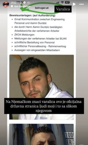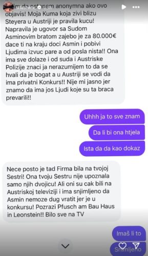 Sita je podelila i poruku žene koja joj se javila na Instagramu, a koja tvrdi da je pravila kuću i za posao angažovala Asmina i njegovog brata koji su je prevarili za 80.000 evra, te da je o tome izveštavala čak i jedna austrijska televizija.