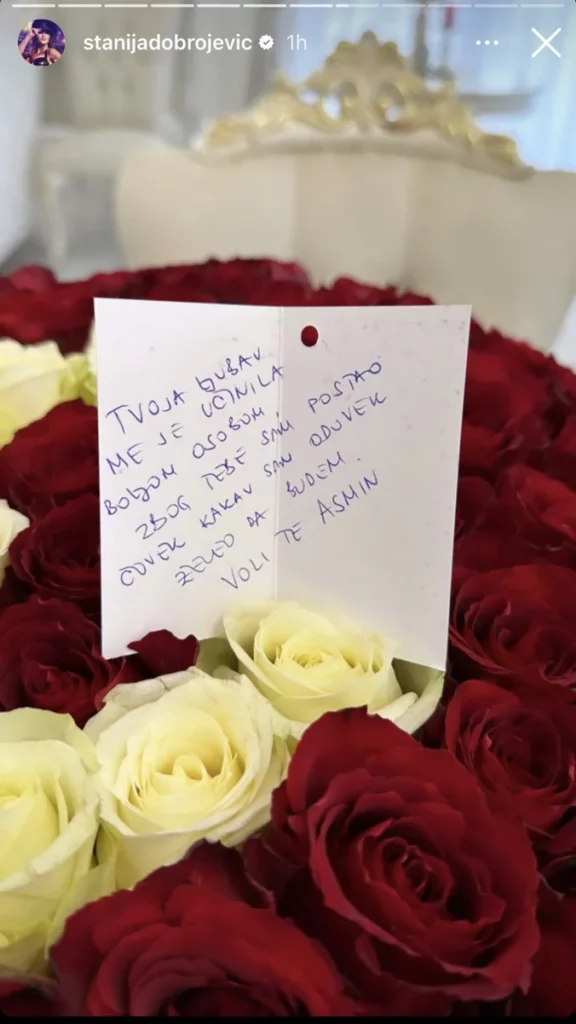 Naime, Stanije je na svom storiju pokazala da joj je Asmin na kućnu adresu poslao ogroman buket ruža uz ljubavnu poruku.
