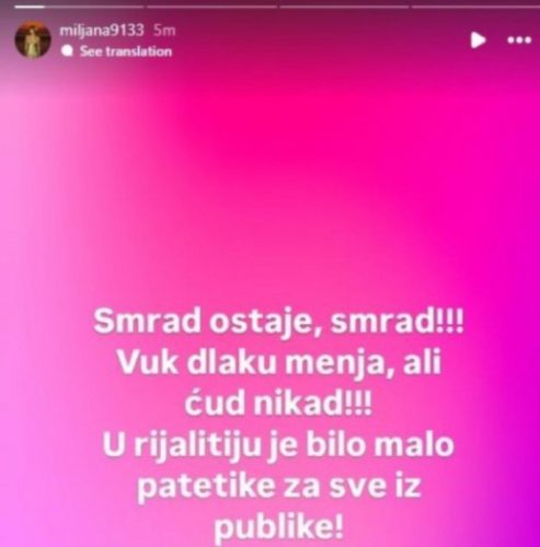 – Smrad ostaje smrad! Vuk dlaku menja, ali ćud nikad! U rijalitiju je bilo malo patetike za sve iz publike – napisala je Miljana i dodala.