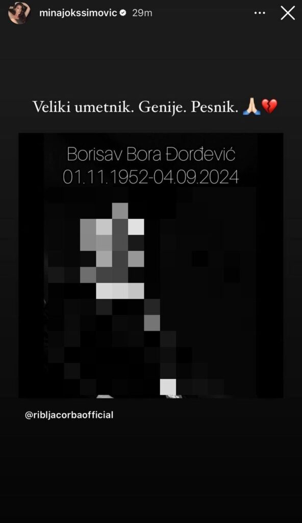 – Veliki umetnik. Genije. Pesnik – napisala je Mina u objavi na Instagramu uz emodžije ruku koje se mole i slomljenog srca.