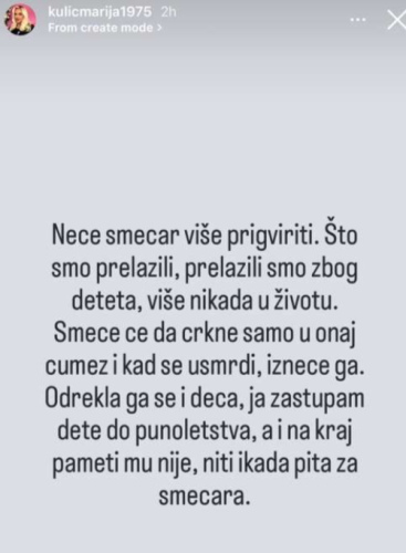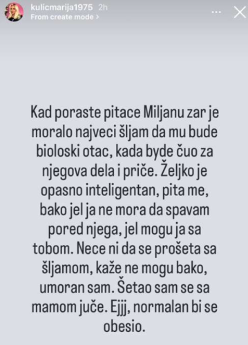 – Kad poraste pitaće Miljanu zar je morao najveći šljam da mu bude otac, kada bude čuo za njegova dela i priče. Željko je opasno inteligentan, pita me:“Bako, je l’ ja ne moram da spavam pored njega? Je l’ mogu ja sa tobom?“. Neće ni da se prošeta sa šljamom, kaže: „Ne mogu, bako, umoran sam. Šetao sam se sa mamom juče“. Ej, normalan bi se obesio – napisala je Kulićka na svom Instagram profilu i dodala da je Marinković blokiran na svim mrežama.