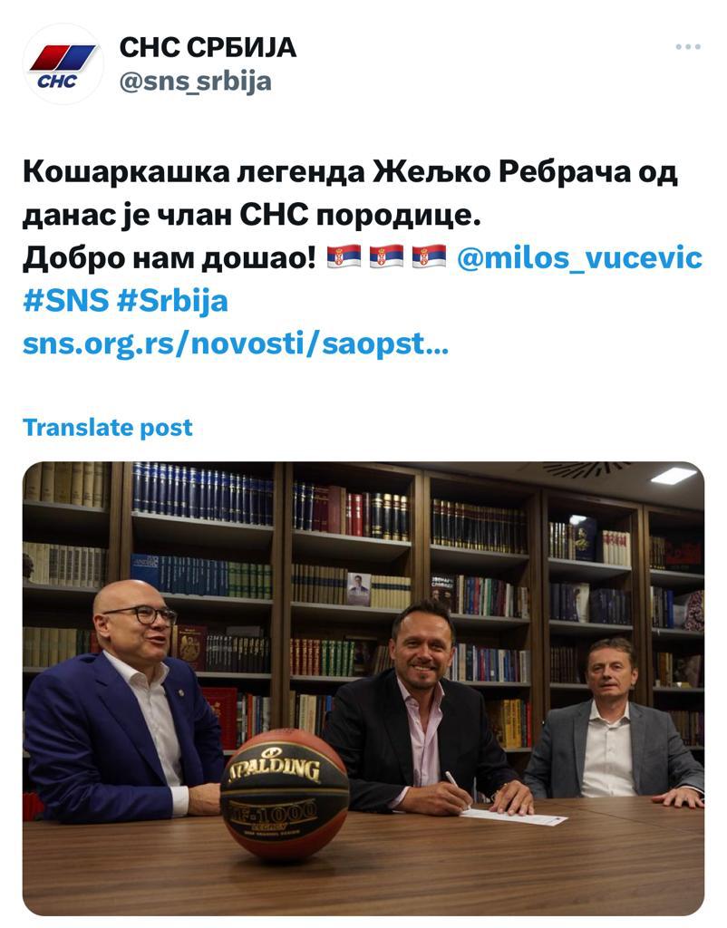 „Košarkaška legenda Željko Rebrača od danas je član SNS porodice. Dobro nam došao!“, stoji u saopštenju objavljenom na službenoj stranici SNS.