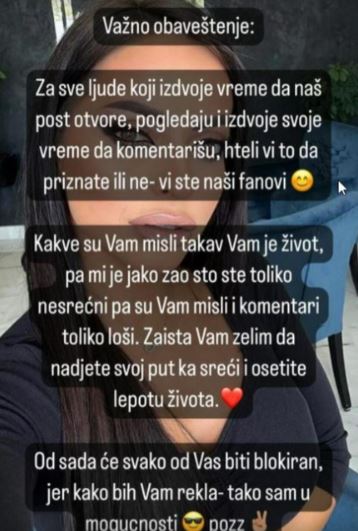 – Važno obaveštenje. Za sve ljude koji izdvoje vreme da otvore naš post, pogledaju i izdvoje vreme da komentarišu, hteli vi to da priznate ili ne – vi ste naši fanovi. Kakve su vam misli takav vam je život, pa mi je žao što ste toliko nesrećni, te su vam i misli i komentari jako loši. Zaista vam želim da nađete svoj put ka sreći i osetite lepotu života. Od sada će svako od vas biti blokiran jer kako bih vam rekla – tako sam u mogućnosti – napisala je Kaća, prenosi Kurir.