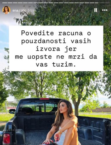 – Povedite računa o pouzdanosti vaših izvora, jer me uopšte ne mrzi da vas tužim – poručila je Ena.