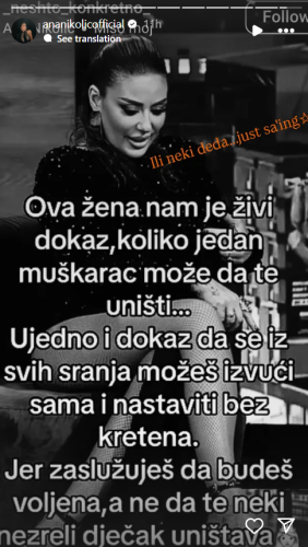 „Ova žena nam je živi dokaz koliko jedan muškarac može da te uništi. Ujedno i dokaz da se iz svega možeš izvući sama i nastaviti bez kretena. Jer zaslužuješ da budeš voljena, a ne da te neki nezreli dečak uništava“, napisali su, a Ana je dodala: