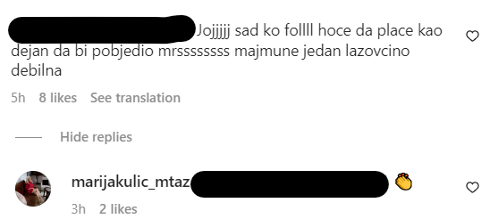 – Joj sad k’o fol hoće da plače kao Dejan da bi pobedio mrš majmune jedan, lažovčono debilna – napisao je gledalac na Instagram stranici ,,Zadruge“.