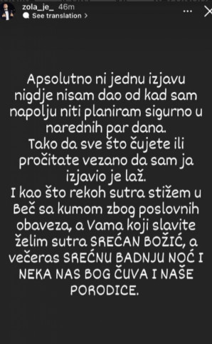 – I kao što rekoh, sutra stižem u Beč sa kumom zbog poslovnih obaveza, a vama koji slavite, želim srećan Božić i Badnju noć. Neka nas Bog čuva i naše porodice – napisao je Zola, a onda, nakon što je stigao u Beč, objavio je i snimak iz kola sa auto-puta uz poruku i reči pesme „Prvi si počeo“, koju izvodi Aleksandra Prijović.