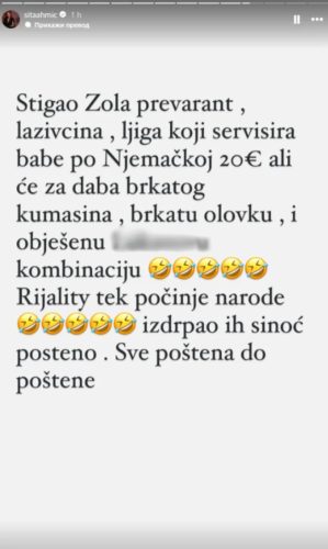 – Stigao Zola prevarant, lažovčina, ljiga koji servisira babe po Nemačkoj 20 evra, ali že za džabe brkatog kumašina, brkatu olovku i obešenu kombinaciju. Rijaliti tek počinje narode, izdrpaon ih sinoć pošteno, sve poštana do poštene – napisala je Sita pa je dodala: