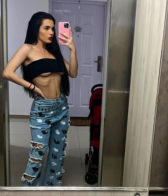 Na jednoj od fotografija pozira u farmerkama i kratkom topiću koji ističe njeno sjajno telo, naglašavajući savršeno ravan stomak i pirsing na pupku.