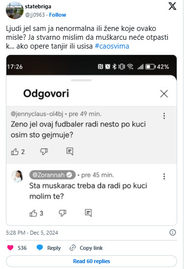 „Ljudi jel sam ja nenormalna ili žene koje ovako misle? Ja stvarno mislim da muškarcu neće optasti k**** ako opere tanjir ili usisa“, napisala je jedna korisnica društvene mreže „X“, a ubrzo su komentari samo nastavljali da se nižu.