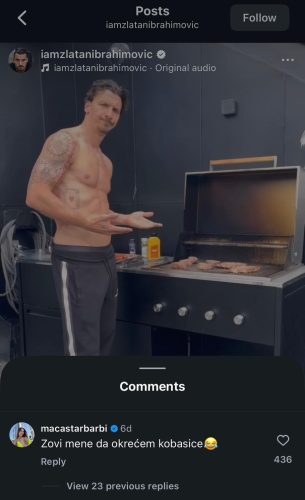 Na videu koji je Ibrahimović podelio, vidi se kako bez majice peče roštilj u dvorištu svoje vile, uživajući u opuštenoj atmosferi. Maca nije ostala ravnodušna pa je ostavila provokativan komentar:
