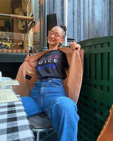 Celu odevnu kombinaciju je uparila sa braon tašnom, belim patikama i providnim naočarima za sunce.